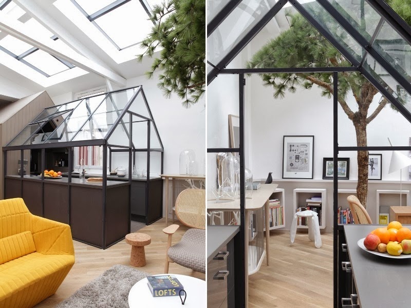uma cozinha e o pinheiro no centro da sala são dois dos elementos mais